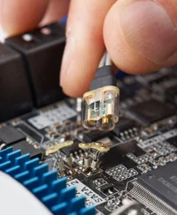 The N2848A QuickTip probe head quickly snaps to the N2849A probe tip, utilizing magnets to connect to the two sides of the differential signal and ground. Multiple N2849A probe tips can be installed on a DUT, allowing quick and reliable measurement of many probe points. The QuickTip supports the InfiniiMode probing when used with the InfiniiMax III+ probe amp and supports differential probing with the InfiniiMax III probe amp.