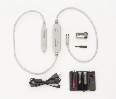 The differential probes has an input resistance of 200 k? and low input capacitance of 1 pF to minimize circuit loading. The N2793A probe is compatible with any oscilloscope with 50 ? BNC input. The probe can be powered by any USB port on scope or computer, or by internal batteries (1x 9V battery included with each probe).